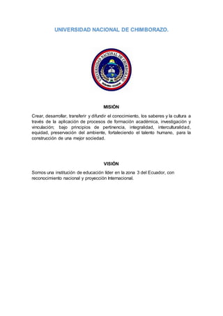 El documento presenta la misión y visión de la Universidad Nacional de Chimborazo, la Facultad de Ciencias de la Educación Humanas y Tecnologías, y la carrera de Psicología Educativa, Orientación Vocacional y Familiar. La universidad busca crear y difundir conocimiento a través de la formación, investigación y vinculación con la comunidad. La facultad forma profesionales de tercer y cuarto nivel en ciencias humanas y educación. La carrera de psicología educativa busca formar psicólog