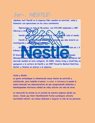 Este documento resume 10 empresas mexicanas destacadas. Proporciona información sobre su misión, visión, historia y directores. Algunas de las empresas discutidas incluyen Nestlé, Grupo Modelo, Del Valle, Bonafont, Bimbo, Barcel y Pemex. Se describen sus operaciones, productos, metas de crecimiento y compromiso con la responsabilidad social.