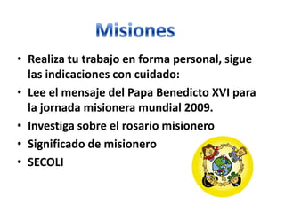 El documento proporciona instrucciones para investigar sobre temas misioneros como el mensaje del Papa Benedicto XVI, el rosario misionero, el significado de la palabra "misionero", y SECOLI. Se pide leer sobre estos temas, analizarlos y explicar su importancia, además de concluir cómo cada uno puede apoyar las misiones.