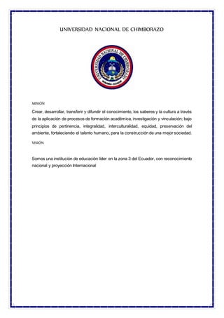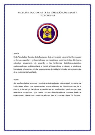 La Universidad Nacional de Chimborazo tiene como misión crear, desarrollar y difundir el conocimiento a través de la formación académica, investigación y vinculación con la comunidad bajo principios de equidad e interculturalidad. Su visión es ser una institución líder en la educación en la zona 3 de Ecuador con reconocimiento nacional e internacional. La Facultad de Ciencias de la Educación, Humanas y Tecnologías forma maestros de acuerdo a tendencias pedagógicas contemporáneas buscando verdad y cultura