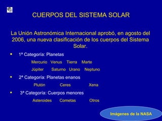 El documento describe los cuerpos del sistema solar, incluyendo los planetas, planetas enanos y cuerpos menores. Detalla las características de cada planeta como su composición, temperatura, atmósfera y satélites naturales. También explica la clasificación actual de los cuerpos del sistema solar aprobada por la Unión Astronómica Internacional en 2006.