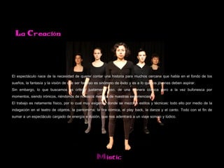 El espectáculo 'Waking Up' de Mistic explora a través de la comedia y la ironía el viaje de una joven que busca alcanzar su sueño de ser famosa, cuestionando la idea de que la fama es sinónimo de éxito. Utilizando técnicas de teatro como playback, pantomima y tiras cómicas, el espectáculo envuelve al espectador en una historia cargada de música y movimiento, mientras se comunican las emociones de la protagonista sin recurrir al diálogo. Esta producción de 35 minutos, dirigida por Miriam González Tamayo, invita a la reflexión sobre las barreras psicológicas que enfrentan los sueños a través de un enfoque físico y lúdico.