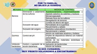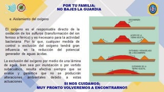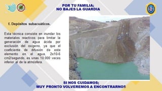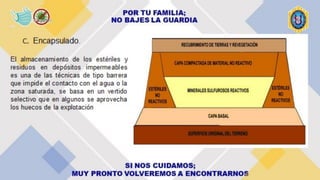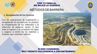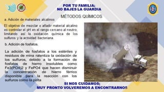 Este documento describe técnicas y tratamientos para el drenaje ácido de minas, analizando casos en Perú. El drenaje ácido de minas se forma cuando los minerales sulfurosos entran en contacto con el agua y el oxígeno, liberando ácido sulfúrico y metales pesados. Los tratamientos incluyen neutralización con productos químicos como carbonato de calcio, aireación, bactericidas, floculantes, resinas de intercambio iónico y humedales construidos con plantas. El caso de la min
