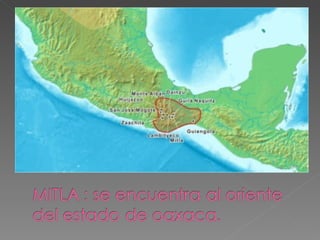 Mitla se encuentra a 46 km de Oaxaca y era un antiguo centro ceremonial zapoteca conocido como "lugar de muertos" en español o "lugar de entierros" en zapoteco, que alude a su función como sitio para el entierro de los muertos.