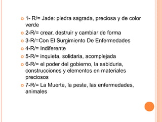 El documento habla sobre el mito chino de la diosa Chang'e. Explica que Chang'e vive en la luna y mantiene el equilibrio entre la vida y la muerte en la Tierra. También se menciona que ella lleva un registro de las vidas y muertes de las personas usando piedras de jade y que su inmortalidad eventualmente causó problemas de sobrepoblación en la Tierra.