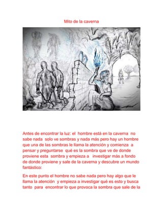 El documento resume el mito de la caverna de Platón, donde los hombres están en una caverna viendo solo sombras en la pared sin saber de dónde provienen. Un hombre se pregunta sobre el origen de una sombra en particular y sale de la caverna, descubriendo el mundo exterior y la verdad. Al salir, el hombre comienza un viaje de sabiduría y comprensión al explorar el mundo más allá de la oscuridad de la caverna.