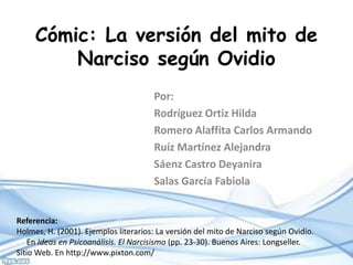 El documento presenta un resumen del mito de Narciso según Ovidio realizado por el Equipo 5 de la Facultad de Medicina de la Universidad Autónoma de San Luis Potosí el 29 de septiembre de 2012. El equipo, formado por 5 estudiantes, analiza la versión del mito presentada en un texto literario y en un sitio web, centrándose en la historia de Narciso y su amor por su propio reflejo.