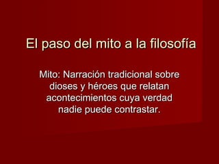 Este documento describe el paso del mito a la filosofía en la cultura griega. Explica que los primeros filósofos griegos, llamados presocráticos, rechazaron las explicaciones míticas y buscaron principios racionales para comprender el universo y la realidad. Analiza las teorías de los primeros filósofos de Mileto como Tales, Anaxímenes y Anaximandro, así como las ideas de Heráclito, los pitagóricos y Parménides. Finalmente, resume las principales características de los filósofos