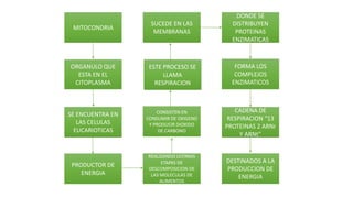 La mitocondria es un organelo ubicado en el citoplasma de las células eucariotas que produce energía a través de la respiración celular y la fosforilación oxidativa. Desempeña funciones vitales como la generación de ATP, transporte de ácidos grasos, almacenamiento de calcio y regulación del ciclo celular y la muerte celular programada. El documento explica detalladamente las funciones y procesos metabólicos de la mitocondria.