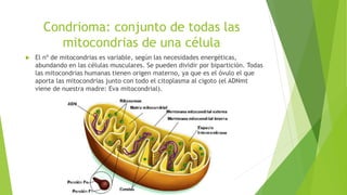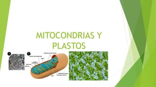 Las mitocondrias y los plastos son orgánulos celulares que desempeñan funciones vitales. Las mitocondrias contienen ADNmt, ribosomas, enzimas y una doble membrana. Generan energía a través de la fosforilación oxidativa. Los plastos como los cloroplastos contienen ADN, ribosomas y membranas. Realizan la fotosíntesis usando la luz solar para producir glucosa a través de las fases luminosa y oscura. Ambos orgánulos derivan originalmente de bacterias