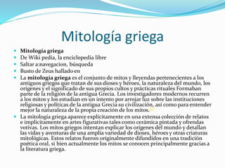 La mitología griega se refiere al conjunto de mitos y leyendas de la antigua Grecia que tratan sobre sus dioses, héroes, el origen del mundo y el significado de sus prácticas religiosas. Estos mitos explicaban el origen del universo y detallaban las vidas de dioses, héroes y otras criaturas míticas. La mitología griega formaba parte integral de la religión y cultura de la antigua Grecia.