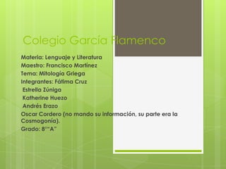 Este documento resume un proyecto de estudiantes sobre la mitología griega. Incluye secciones sobre cosmogonía, teogonía, leyendas como las de Leto y Atlas, centros de adoración como el Olimpo y Delfos, construcciones como el Partenón, y libros sagrados como la Septuaginta. Los estudiantes son Fátima Cruz, Estrella Zúniga, Katherine Huezo y Andrés Erazo de 8° grado en el Colegio García Flamenco.
