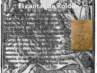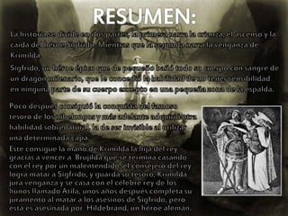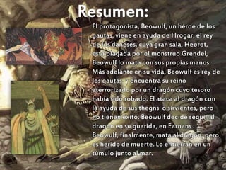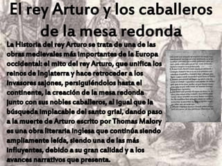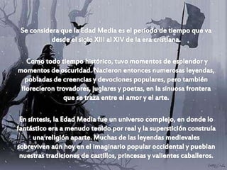 El documento explora la mitología medieval, destacando figuras como magos y brujas, y criaturas míticas como dragones y unicornios. Los magos, representados por Merlín, suelen ser benevolentes, mientras que las brujas, como Morgana, pueden ser maliciosas. Los dragones son adversarios tradicionales en las narrativas heroicas, y los unicornios simbolizan amor y pureza.