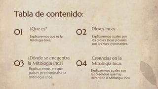 La mitología inca se originó en el área de Cusco en Perú y predominaba en los países andinos como Perú, Bolivia y Ecuador. Los dioses más importantes eran Inti, el dios del sol; Viracocha, el dios creador; y Pachamama, la diosa de la tierra y la fertilidad. Las creencias incas incluían la adoración de la luna, la importancia de los ciclos lunares en la agricultura, y la noción de dualidad entre conceptos como el día y la noche.