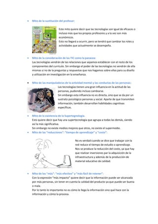 El documento describe varios mitos comunes sobre el uso de la tecnología en educación. Algunos de estos mitos incluyen que la tecnología proporciona acceso ilimitado a la información, que puede sustituir a los profesores o que reducirá el tiempo y costo de aprendizaje. Sin embargo, el documento argumenta que ninguno de estos mitos es completamente cierto y que el valor de la tecnología depende de cómo se utilice, no de la tecnología en sí misma.