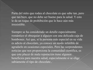 El documento resume los mitos y beneficios para la salud del chocolate. Aunque el chocolate contiene sustancias que pueden mejorar la salud como antioxidantes, también contiene azúcar y grasa que lo hacen poco saludable si se consume en exceso. El chocolate negro puede ser una mejor opción que el chocolate con leche. Dar chocolate a las mascotas no es recomendable debido a que contiene teobromina que los animales no pueden digerir bien.