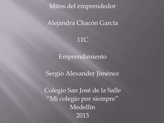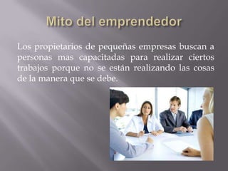 El documento discute los mitos comunes sobre el emprendimiento. Señala que las pequeñas empresas a menudo buscan personas más capacitadas para realizar trabajos porque no se están haciendo las cosas correctamente. También indica que muchas personas intentan iniciar un negocio pero fracasan a los dos años debido a que no pueden hacer crecer o expandir la empresa. Finalmente, resalta que para tener éxito se requiere trabajo duro y constante y que las personas deben estar dispuestas a cambiar y hacer que la empresa prospere.