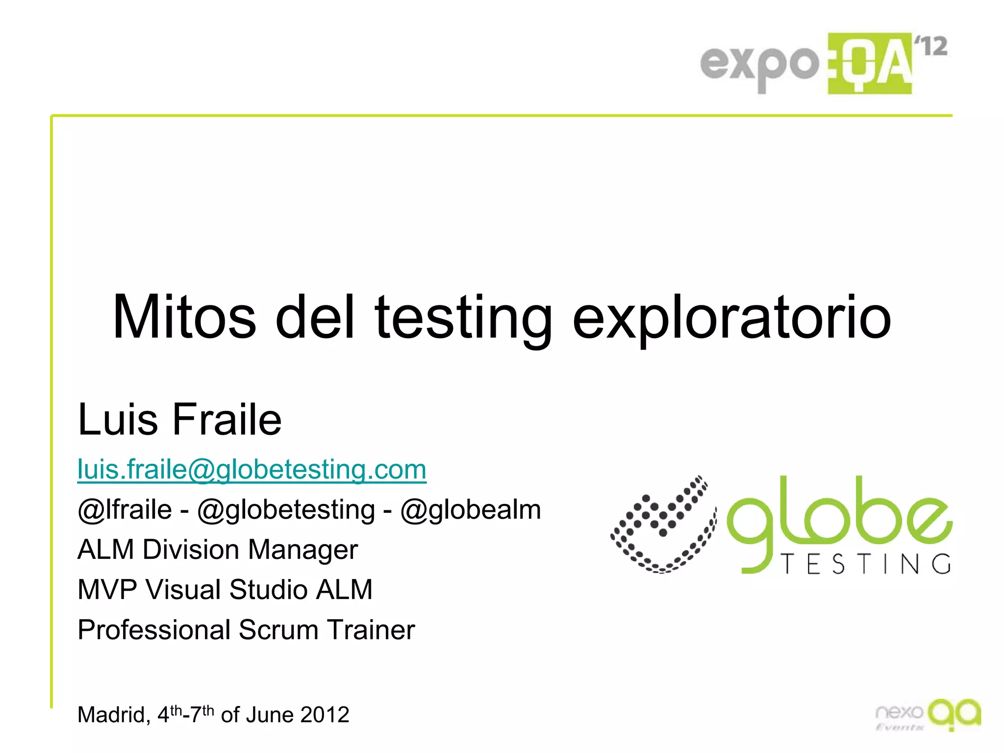 El documento aborda mitos sobre el testing exploratorio, resaltando que este no es simplemente ejecución ad-hoc, sino un enfoque organizado y creativo que busca maximizar el valor del cliente a través de la detección temprana de defectos. Se discuten diversas percepciones erróneas sobre la medición del progreso, la duración de las pruebas y la necesidad de documentación, enfatizando la importancia de la experimentación y la adaptación. Además, se presentan herramientas modernas que facilitan la gestión y ejecución del testing, promoviendo un enfoque más efectivo dentro de entornos ágiles.