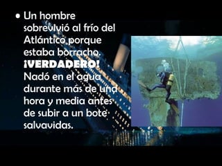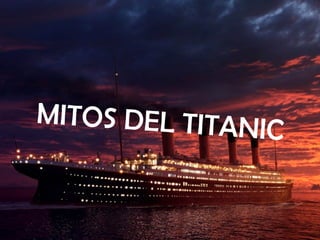 Este documento analiza varios mitos sobre el Titanic, declarando algunos como verdaderos y otros como falsos. Se menciona que un hombre sobrevivió al frío del Atlántico nadando durante más de una hora y media antes de subir a un bote salvavidas debido a que estaba borracho, y que también es verdad que algunos hombres escaparon disfrazados de mujer. Sin embargo, se declaran falsos otros mitos como que el número del casco decía "No Pope", que un trabajador quedó atrapado durante la construcción, o que la banda continu