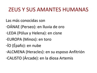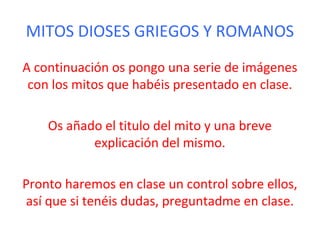 Este documento presenta un resumen de varios mitos griegos y romanos relacionados con dioses como Zeus, Poseidón, Hades, Hera, Deméter, Afrodita, Apolo, Artemis, Atenea, Hermes, Hefesto y Dionisos. Explica brevemente las historias detrás de cada dios, incluyendo sus amantes, compañeros, hijos y hazañas más conocidas. El propósito es preparar a los estudiantes para un próximo examen sobre estos mitos antiguos.