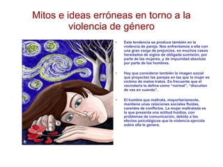 Este documento analiza 12 mitos comunes en torno a la violencia de género. Refuta cada mito explicando brevemente la realidad de la situación. Entre los mitos refutados se incluyen que los problemas se resolverán con el tiempo, que el amor puede cambiar al agresor, y que la violencia doméstica solo ocurre en familias con problemas. El documento concluye que la mayoría de los agresores actúan con pleno conocimiento y responsabilidad de sus acciones.