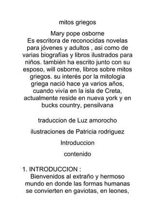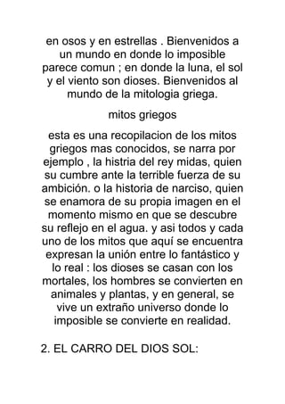 Este documento narra el mito griego de Faetón, hijo del dios Helios (el Sol). Faetón le pide a su padre conducir el carro del sol por un día, pero pierde el control de los caballos y casi quema la Tierra. Júpiter lo mata con un rayo para salvar al mundo. También se menciona brevemente el mito de Midas, quien pide el don de convertir todo lo que toca en oro.