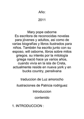 El documento resume el mito griego de Faetón, hijo del dios sol Helios. Faetón le pide a su padre que le permita conducir el carro del sol a través del cielo para probar que es realmente su hijo. A pesar de las advertencias de Helios, Faetón no puede controlar los caballos de fuego y quema la tierra. Júpiter mata a Faetón con un rayo para detener el incendio, causando gran dolor a Helios.