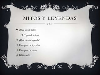Este documento explica la diferencia entre mitos y leyendas. Los mitos son historias que usan metáforas y dioses para explicar cosas, mientras que las leyendas usan seres humanos y elementos sobrenaturales. Los mitos incluyen cosmogónicos sobre la creación, teogónicos sobre los orígenes de los dioses, y etiológicos sobre el origen de instituciones. Las leyendas se transmiten de generación en generación y contienen elementos de la realidad. El documento proporciona ejemplos como Hércules y La