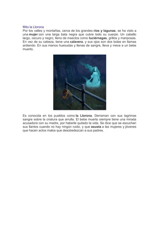 El documento presenta tres mitos diferentes. El primero trata sobre una niña que tenía una amiga invisible que la salvó de caer en un lago congelado, pero años después la apuñaló en un sueño hasta matarla. El segundo habla sobre La Llorona, una mujer que se pasea llorando con un bebé muerto en brazos. El tercero narra la historia de Pandora y la caja que contenía todos los males del mundo.