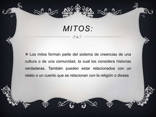 Este documento presenta información sobre mitos y leyendas de los antiguos mexicanos. Explica que los primeros dioses creadores fueron Tonacatecuhtli y Tonacacihuatl, quienes tuvieron cuatro hijos que crearon la tierra y al primer hombre y mujer. También presenta la leyenda de "La niña del panteón" sobre dos jóvenes que se perdieron en un cementerio y fueron guiados por una niña fantasma.