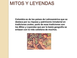 Colombia se destaca por su riqueza en tradiciones orales como los mitos y leyendas que se relacionan con la vida cotidiana. Un mito es una explicación divina del origen de una civilización con sentido oculto, mientras que una leyenda es una narración oral o escrita con elementos históricos e imaginativos. Algunas leyendas colombianas incluyen El Mohan, un terror de los ríos; La Llorona, un espíritu que lamenta haber matado a su hijo; y La Patosola, una defensor