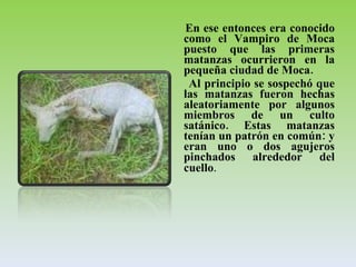 El documento describe la historia y teorías sobre el Chupacabras, una criatura mítica reportada en Puerto Rico en los años 90 por matar animales domésticos con dos agujeros en el cuello. Algunos testigos lo describen como una figura extraterrestre o con capacidad de hipnotizar, mientras que otros creen que es producto de histeria masiva o ataques de depredadores conocidos. Existen diferentes teorías sobre su apariencia, pero no hay pruebas concluyentes sobre su existencia.