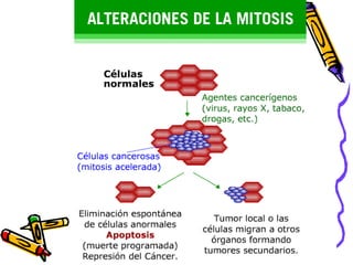 Este documento describe las etapas de la mitosis (profase, metafase, anafase y telofase) y la importancia biológica de este proceso de división celular que mantiene el número de cromosomas y material genético en las células hijas. La mitosis permite el crecimiento, desarrollo y reemplazo celular en organismos multicelulares.