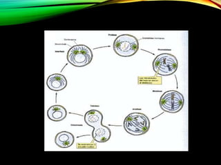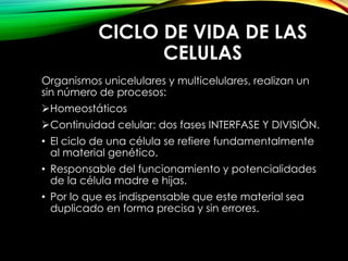 El documento describe el ciclo celular, incluyendo las fases de interfase y división celular. La interfase es la fase más larga en la que la célula crece y se prepara para dividirse. La división celular, llamada mitosis, consiste en 5 etapas (profase, prometafase, metafase, anafase y telofase) donde el material genético se duplica y distribuye igualmente entre las dos células hijas, las cuales son idénticas a la célula madre. La mitosis asegura la continuidad gené