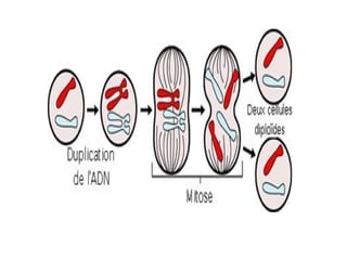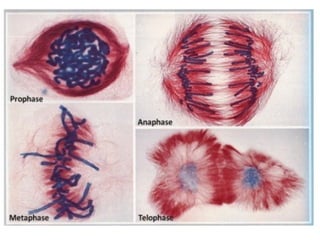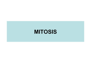 La mitosis tiene como objetivos que las células hijas tengan la misma constitución genética y organización que la célula original, garantiza el crecimiento somático y la herencia de características de célula a célula. Se divide en 4 fases: profase, metafase, anafase y telofase. La importancia de la reproducción celular por mitosis incluye mantener constante el número de cromosomas, transmitir los caracteres hereditarios y permitir el crecimiento y reproducción de organismos.