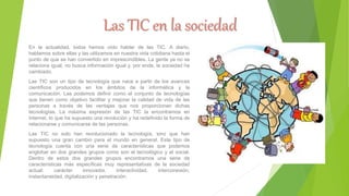 El documento describe cómo las Tecnologías de la Información y la Comunicación (TIC) se han vuelto esenciales en la sociedad moderna y cómo afectan la forma en que las personas se comunican y obtienen información. Las TIC se usan ampliamente en las comunidades de los compañeros del autor para comunicarse, compartir información local y facilitar el trabajo y la educación.