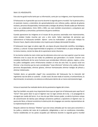 El documento presenta información sobre las salas 1 y 2 de un museo sobre el Holocausto y genocidios. La sala 1 describe el Holocausto, incluyendo detalles sobre los campos de concentración y guetos donde los judíos eran maltratados y forzados a trabajos. La sala 2 trata sobre genocidios y crímenes contra la humanidad, definiendo genocidio y describiendo otros eventos como el de Ruanda y Guatemala.