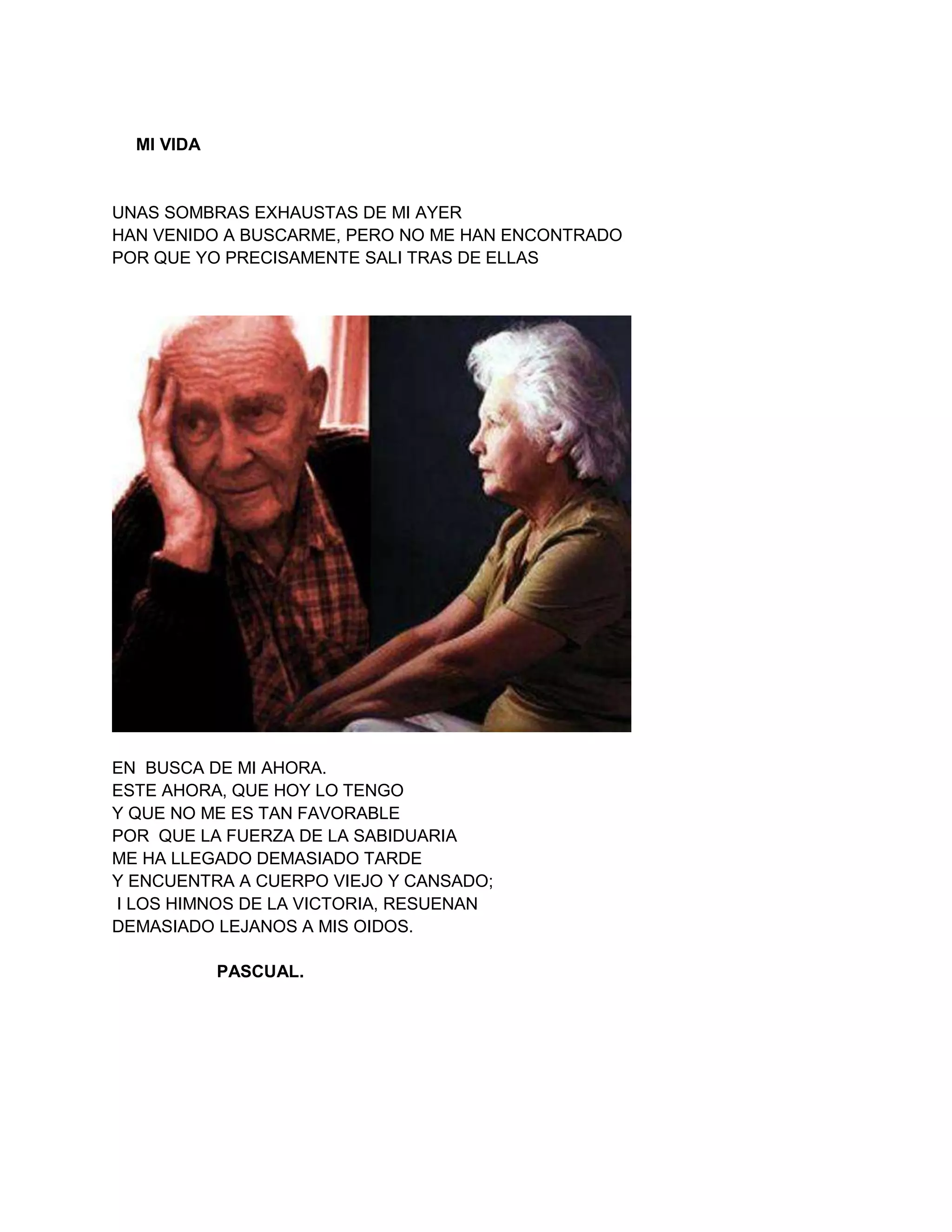 El poema habla sobre cómo las sombras del pasado han venido a buscar al poeta pero no lo han encontrado porque él salió tras ellas en busca de su presente. Aunque tiene su presente, no le es favorable porque la sabiduría le llegó demasiado tarde y su cuerpo está viejo y cansado, por lo que los himnos de la victoria resuenan demasiado lejanos para él.