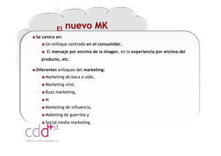 El documento analiza la transición del marketing 1.0 al 2.0, enfatizando la importancia de centrarse en el consumidor y la personalización a través de herramientas digitales. Describe diversos enfoques modernos como el marketing de boca a oído y el social media marketing, mientras resalta la necesidad de medir la efectividad y el retorno de la inversión. Finalmente, se abordan las mejores prácticas en email marketing y la importancia de la creación de listas segmentadas y permisos para maximizar el impacto de las campañas.
