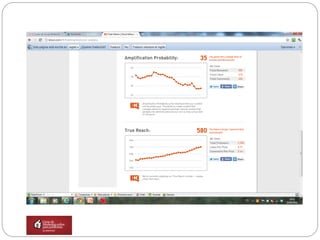 El documento discute el uso de herramientas de monitoreo y análisis para medir el impacto de una marca en internet. Sugiere crear una cuenta en plataformas de agregación de feeds para monitorear noticias, blogs, redes sociales y comentarios usando palabras clave relevantes. También recomienda utilizar herramientas como Google Analytics, TweetStats y HowSociable para medir métricas cuantitativas y cualitativas como tráfico, menciones e influencia en la toma de decisiones.