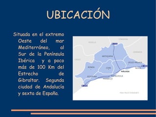 Málaga se encuentra al sur de España, en la costa mediterránea. Es la segunda ciudad más grande de Andalucía y sexta de España, con una población de más de 1.5 millones de habitantes. Málaga ha sido un importante centro industrial, turístico y cultural desde el siglo VIII a.C. Actualmente atrae a inmigrantes y tiene una economía diversificada centrada en el turismo, la industria y los servicios.