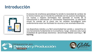 El documento describe el m-learning o aprendizaje móvil, que permite el acceso a contenidos educativos a través de dispositivos móviles. Explica que el m-learning ofrece flexibilidad y estimula la responsabilidad de los estudiantes. También destaca ventajas como la construcción de conocimiento a bajo costo y la posibilidad de aprender en cualquier lugar y momento, aunque señala algunas desventajas como pantallas pequeñas y baterías con poca duración. Finalmente, concluye que el m-learning ha llegado para qued