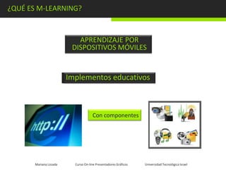 El documento describe el concepto de m-learning o aprendizaje electrónico a través de dispositivos móviles. El m-learning permite brindar capacitación e información a usuarios mediante diferentes dispositivos móviles como teléfonos inteligentes y tabletas, permitiendo experiencias educativas en cualquier lugar y momento. Algunas ventajas del m-learning son que supera las limitaciones de tiempo y lugar al permitir el acceso a la información desde cualquier dispositivo móvil y en cualquier lugar.