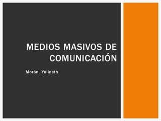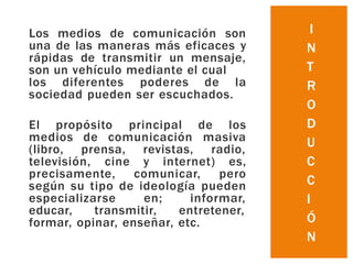 El documento describe los diferentes medios de comunicación masiva como el libro, la prensa, la revista, la radio, la televisión, el cine e Internet. Explica brevemente las funciones de cada medio, incluyendo informar, educar y entretener al público. También proporciona algunos detalles históricos sobre el desarrollo de cada medio de comunicación.