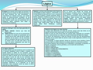 La lógica es el estudio de las reglas del pensamiento y la razón. Examina conceptos, juicios y razonamientos, y los métodos para distinguir entre razonamiento correcto e incorrecto. Está relacionada con todas las ciencias porque proporciona las teorías para demostraciones científicas. La lógica tiene una historia que se remonta a Aristóteles y su obra "Organon", y ha evolucionado en los siglos posteriores con contribuciones de pensadores como Boole, Frege, Russell y Wittgenstein.