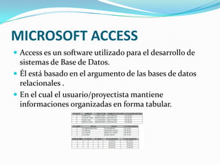 Este documento describe las funciones básicas de Microsoft Access, incluyendo tablas, formularios, consultas e informes. Access es un software de base de datos relacional que almacena información en una sola base de datos (.mdb). Las tablas contienen registros y campos, y cada campo tiene un tipo de datos como texto o número. Los formularios y consultas se usan para ingresar, ver y modificar datos, mientras que los informes generan reportes impresos de la información.