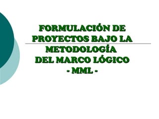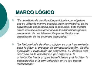 El documento describe la metodología del marco lógico (MML), que es una herramienta para planificar, ejecutar y evaluar proyectos de manera estructurada y participativa. El MML ayuda a identificar problemas, establecer objetivos, definir actividades y indicadores, y facilita la gestión del ciclo del proyecto desde el diseño hasta la evaluación. Se originó en la década de 1970 y es ampliamente utilizado por agencias de desarrollo. El documento explica los pasos clave del MML como el análisis