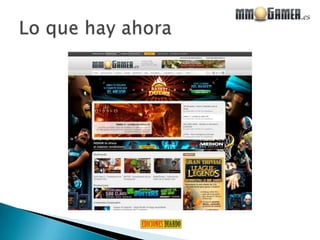 Este documento describe un proyecto informativo sobre juegos multijugador masivos en línea (MMO) en España. El proyecto ha crecido rápidamente en sus primeros meses y tiene un equipo de 1 director, 1 editor, varios colaboradores y columnistas. El proyecto ofrece contenido especializado sobre MMO para una audiencia específica a través de varios canales y ha logrado más de 10,000 usuarios registrados. El objetivo es expandirse a nuevos mercados como el Reino Unido y Estados Unidos.