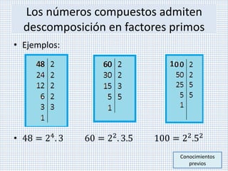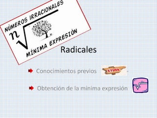 El documento describe los conocimientos previos necesarios para trabajar con raíces. Explica cómo obtener la mínima expresión de un radical mediante la factorización del radicando, la aplicación de propiedades como la raíz de raíz y la distribución de la radicación sobre la multiplicación, y el uso de potencias de potencias. Proporciona varios ejemplos para ilustrar cada paso del proceso de simplificación.