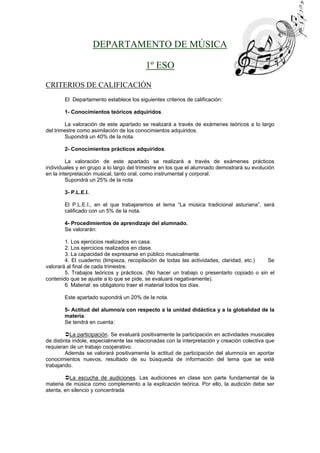 Este documento establece los criterios de calificación y los mínimos exigibles para la asignatura de Música de 1o de ESO. Los criterios de calificación incluyen conocimientos teóricos y prácticos, un proyecto de investigación, procedimientos de aprendizaje y actitud. Los mínimos exigibles cubren conceptos, procedimientos y actitudes relacionados con la lectura y la interpretación musical, así como el reconocimiento de elementos, géneros e instrumentos musicales.